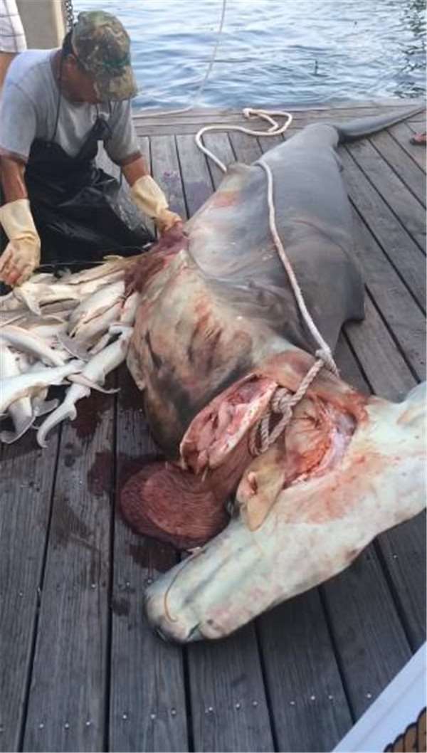 而如今国际开始针对某些海洋生物进行保育,但是却仍因为渔民或是非法捕鱼者的无知和贪婪,无数保育类鲨鱼依然逃不出死亡宿命。在美国佛罗里达州,有位渔民出海捕鱼,不小心误捕到一只锤头鲨。原本一行人是打算将它原放回海洋,因为他们一般是只捕鲶鱼的,没想到却发现鲨鱼已经不幸死亡。看着这只鲨鱼异常肥大的腹部,他们甚至对它做了这件事。