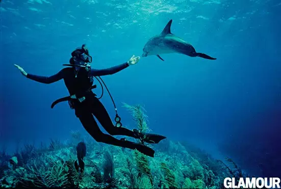 (图片来自于网络。摄于1970年,西尔维亚在巴哈马,与海豚“桑迪”共游)