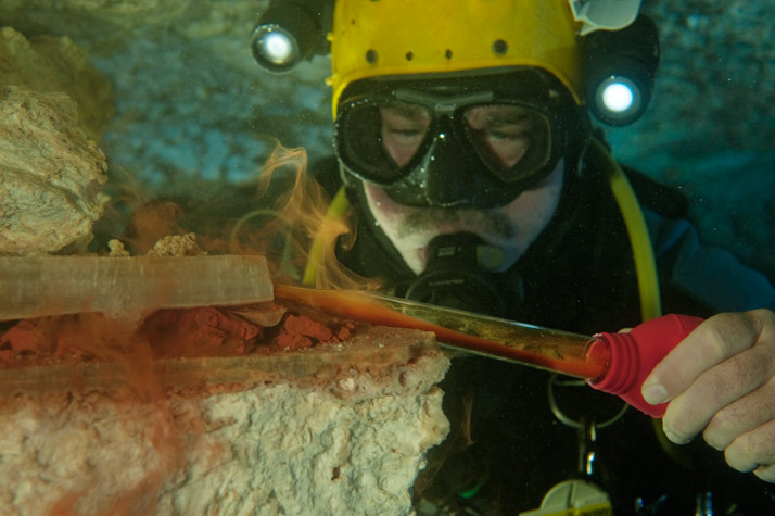 在锯木厂水槽,人类学家Kenny Broad作为探险活动的领导者,通过细菌层探索潜水。