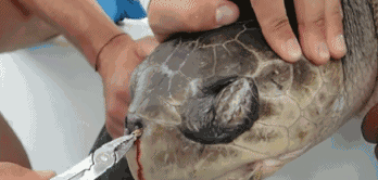 血从海龟的鼻孔里流了出来,但是异物还是没有取出。
