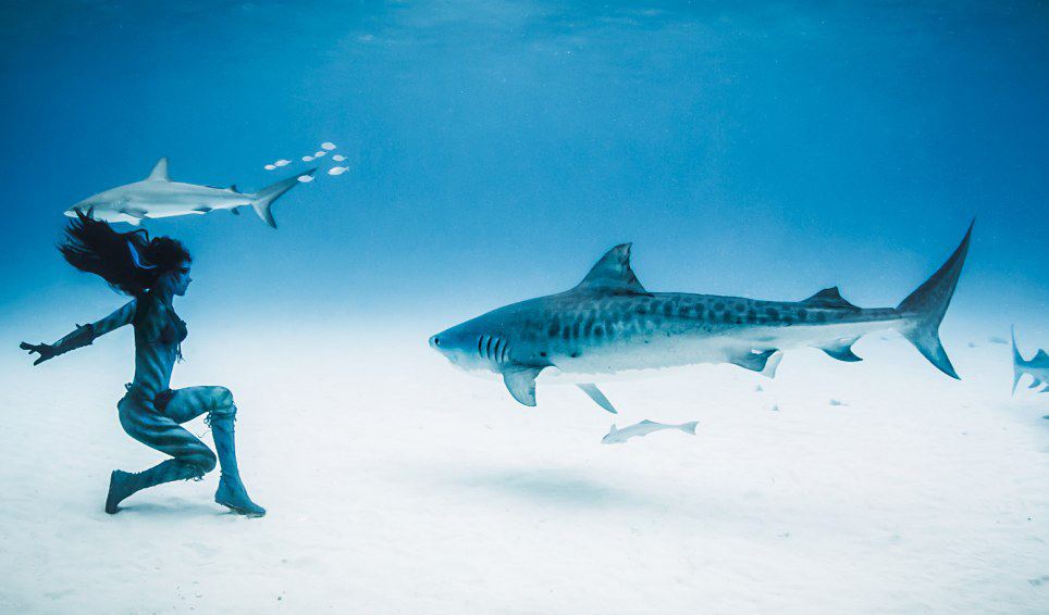 美女模特与虎鲨群海底共舞