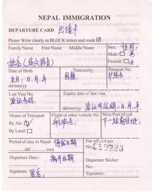 入境卡正面: